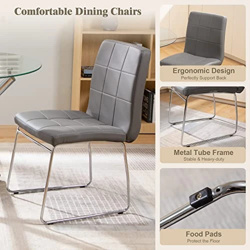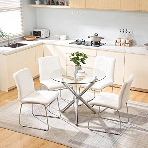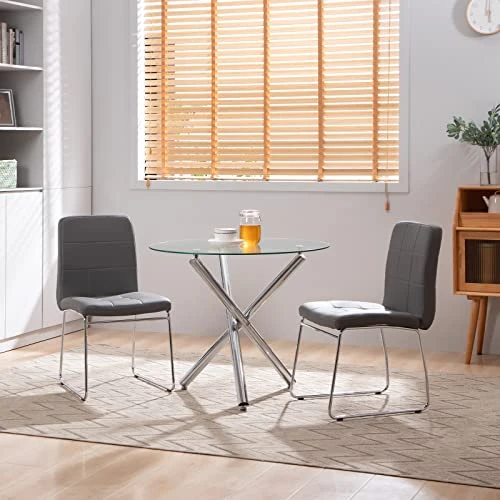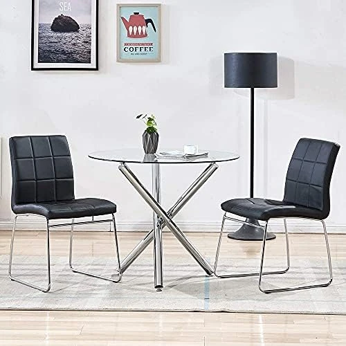 - Sturdy Dining Table Sets of 2: The table and chair set are made of a high-quality steel tube frame and tempered glass table top. The steel frame and glass top of the round glass table are rust-proof and Anti-scratch, staying like new for years. The seat and back of metal chairs are made of faux leather and upholstered by sponge, breathing, soft, and comfortable.
