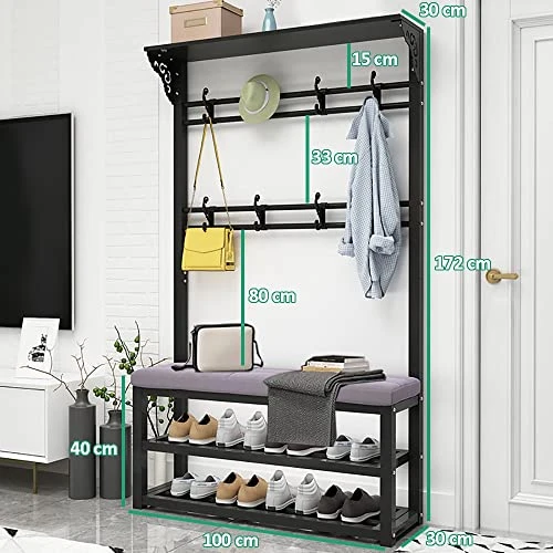 Coat rack, shelf, shoe cabinet and plush upholstered seat in one, bringing you a space-saving hallway storage solution. Keep your living room or bedroom neat and tidy with ease with this hall tree.