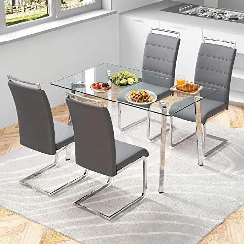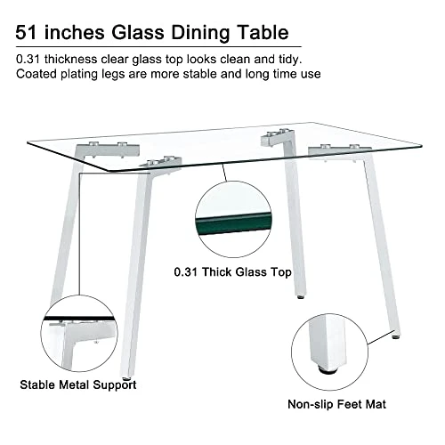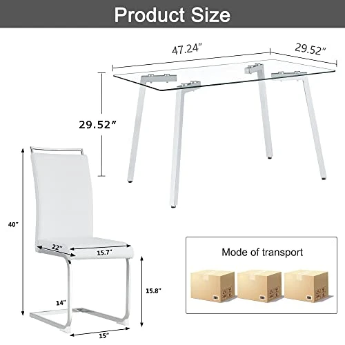 - Dining Table and Chairs Material:The tempered glass better then normal glass ,won’t fragile ,and it is heat temperature resistance and scratching resistance.The modern dining chairs made of high quality pu leather ,filled with sponge with sturdy metal legs.It will offer the good seating feeling when you back at home .