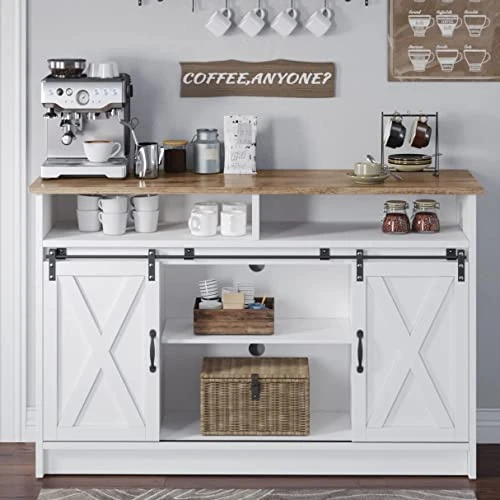 - MULTIPURPOSE BUFFET CABINET: This farmhouse coffee bar cabinet 52’’ is versatile and can be the perfect storage cabinet to keep your things organized, whether in the bar, kitchen or living room, dining room or coffee bar. It can be used as a TV cabinet, farmhouse coffee bar cabinet, kitchen buffet storage cabinet, etc. when used at home. It not only improves the comfort and cleanliness of the living space, but also makes the living room more beautiful.