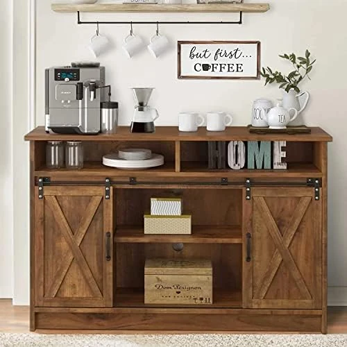 - COFFEE BAR CABINET WITH SLIDING BARN DOORS: A unique farmhouse style dining buffet cabinet with storage complements any style of your dining room. The combination of brown wood and black metal also reflects the modern style. Flexible barn doors can slide to either side to create closed storage cabinets. Sliding doors can create a symmetrical aesthetic on either side or in the middle.