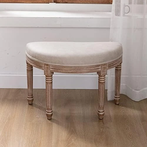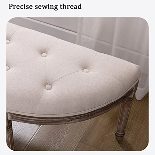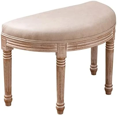 - Graceful accents: The thick foam padding of this rounded bench incorporates diamond tufting, while the solid wooden legs are delicately carved with vintage fluting.