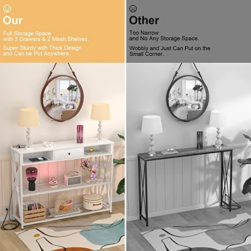 - Multi Applications – This entry table with outlets is multi functional. It is a perfect console table, foyer table, sofa table, behind couch table, entryway table, TV console, plant stand, fish tank stand, bar table for your entryway, foyer, sofa couch, hall, living room, bar.