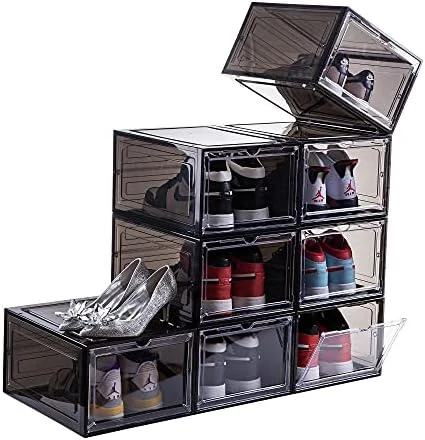 - Sturdy and stackable, more user-friendly: Made of durable, high-quality hard plastic, strong and thick , easy to clean. In order to make the stacking of sneaker box more stable, we have adopted an interlocking design, each box is equipped with 6 small bolts, which can be firmly stacked together and make reasonable use of space.