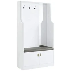 Simplistic and modern in style, this hallway cabinet is made of composite wood and high gloss finish in a sleek white color. This piece features three hooks and a faux leather cushion seat as well as two shelves, providing a convenient storage area for Shoes, and out the door necessities.