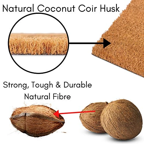- NATURAL COIR: Made from the strong and durable husk of coconuts allowing the doormat to be resistant to saltwater, rain, and other weather elements. The back of the mat is vinyl backed, giving it adhesive grip to the floor along with making it able to avoid moisture