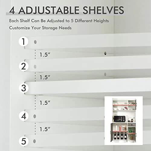 - Adjustable Shelf Design: This freestanding buffet is equipped with 4 adjustable shelves, and each shelf can be adjusted to 5 different heights. According to the item size, you can freely adjust the position of shelves up and down, or remove the shelf to create a single cabinet to store large articles.