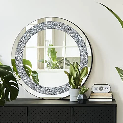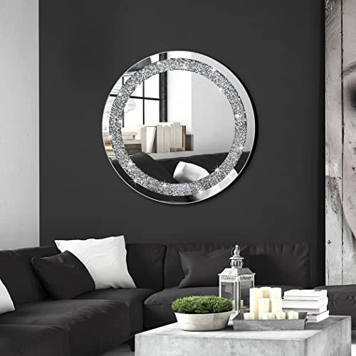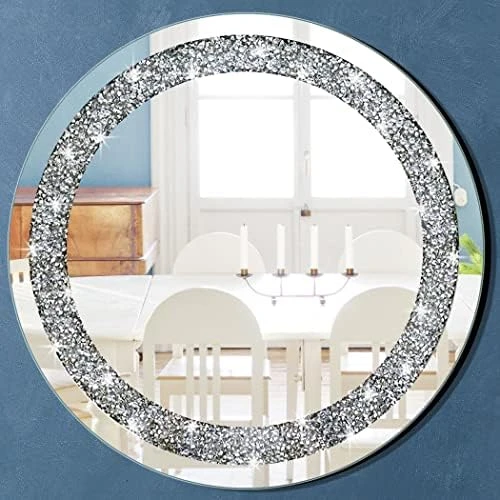 - Material: beveled silver mirror with sparkly crystal crush diamond jewellery decoration, 2 big hangers ready for wall Hang. The mirror is constructed by MDF wood back for reinforcement and stability.