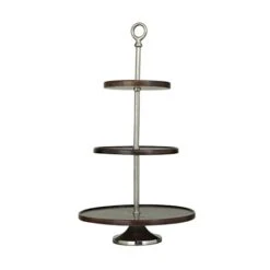 - FEATURES ROUND TIERED SERVER: Polished brown wood trays complement the metal silver stand with top ring handle and flat base