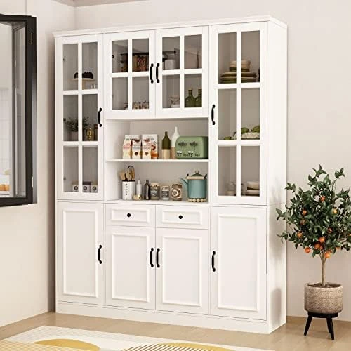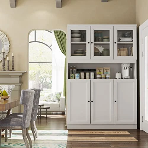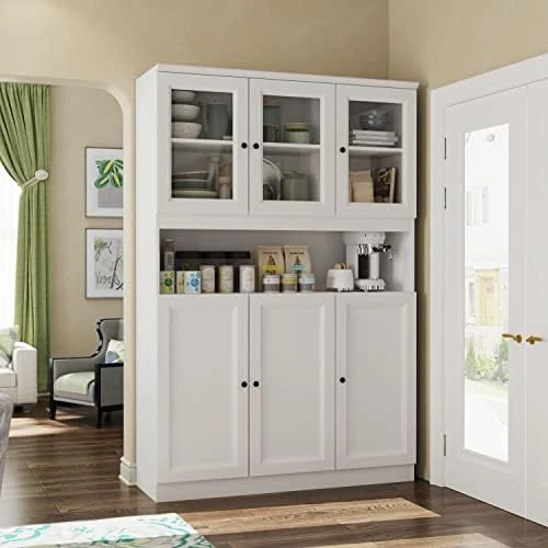 - [Ample Storage] – Featuring different sizes of storage shelves, this large kitchen pantry cabinet provides sufficient space to organize your food containers, spice, tableware, bowls and so on. 2 of shelving laminates are adjustable in pre-drilled positions to fit your items. The hutch storage offers extra working space to display blender, microwave, office machine, fruits, etc.