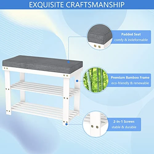- STURDY & SOLID: The bamboo shoe bench is made of tenacious natural bamboo reinforced by 2-in-1 screws, the bench shoe rack with seat is durable and stable, support up to 330lbs. Smooth edges and sunken screws prevent snagging. Stable shoe organizer for entryway with bench will be last for years of usage.
