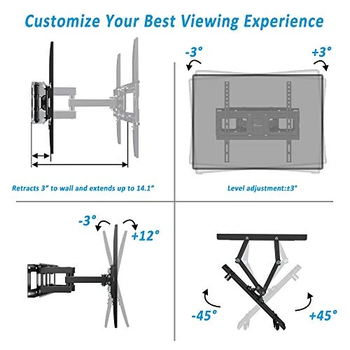 - 🤣 Adjustable View Comfortable: Tilts TV Up 3° And Down 12° To Reduce Glare, Swivels TV Left Or Right According To Your Seats Position. Pull Out To 14.1” And Retract Back To 3.0”, Making Your TV Alive To Move.