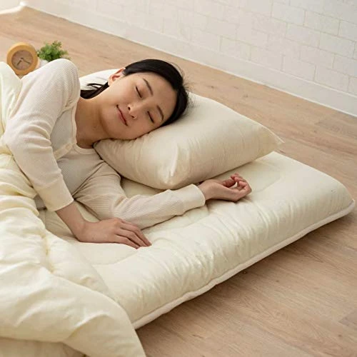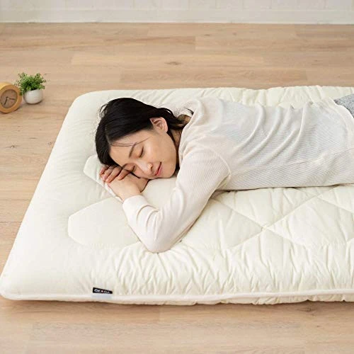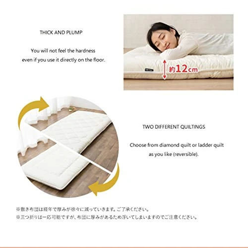- [Dimensions] 39x79in (100x200cm), 4in (10-12cm) in thickness [Weight] 11.6lb (5.3kg) [Materials] Soft Filling (top and bottom): 50% French wool, 50% Polyester (4lb/1.9kg), Firm Pads (middle): 100% Polyester (6.4lb/2.9kg), Outer fabric: 100% natural cotton, 200 thread counts