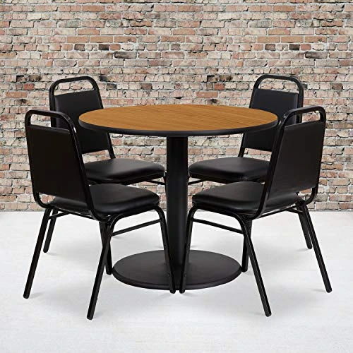 - Set Includes 4 Banquet Chairs, Round Table Top and Round Base