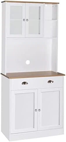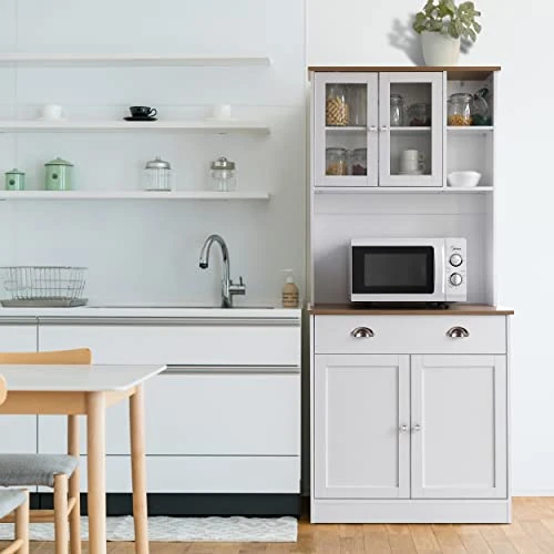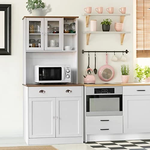 - ATTRACTIVE SHAPE & CLASSIC DESIGN – This kitchen pantry cabinet can fit into many rooms and home styles, with shiny metal handles and clear glass doors adding more likability to the storage cabinet with hutch.