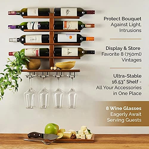 - SMART WINE ACCESSORIES SHELF – 16.5” W Shelf – Stunning wood wine decor for kitchen keeps your favorite wine bottle opener, wine corks, and stylish hors d’oeuvres serving plates within easy reach on your wall-mounted wine rack, making it an ideal gift for new apartments or fine, large homes.