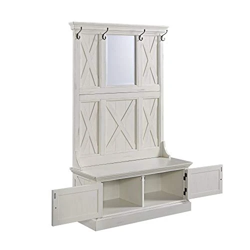 Rustic aged look of weathered wood combined with signature “X” frame pattern provides a warm inviting cottage feel. Wire brushed wainscot inset mahogany veneer panels, with wire brushed solid mahogany frames, provide a unique weather look, and then combined with a hand rubbed white painted finish, provides a completely aged look, with no 2 pieces being the same. Full length bench with two lower doors open to individual storage areas behind each door. Large beveled glass mirror. Four individual coat hooks are finished in the matching antiqued nickel as the door pulls. Note finish and measurements may vary slightly. Assembly required. W-45”, D-19”, H-74