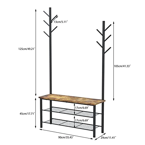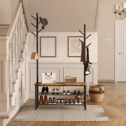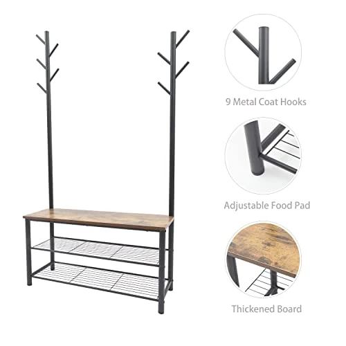 - VERSATILE ENTRYWAY SHOE BENCH WITH 9 HANGING HOOKS: A perfect Shoe storage with a coat hanger for the front door area, doorway, foyer, entryway, mudroom, and walkway. It functions well as a shoe bench and a storage shelf with a coat stand. It serves multiple purposes, somewhere to hang clothes before going to bed, a place to put on shoes, and a place to sit to put on shoes. Its compactness and size keep shoes and purses in order.