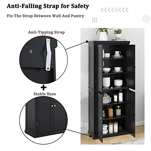 - Premium Quality&Safety- Safety always comes firstly. To avoid falling or tipping, there is an anti-tipping strap on the back of the pantry so that it can be fixed in the wall to keep stable. Besides, the whole body is made of premium P2 grade MDF which will ensure a durable,water-resistant and scratch-resistant cabinet.