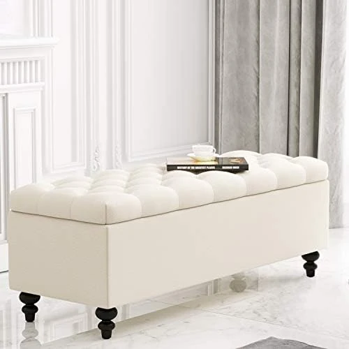 - 【FIRM & SECURITY】 This ottoman with storage is made of solid and engineered wood to ensure stability. It can hold up to 300 pounds of weight (static load capacity).The inside of this storage ottoman is connected by safety pressure hinges and sturdy hardware accessories.They can keep the lid always open to prevent the end of bed bench from closing suddenly, or they can gently and slowly fall when you want to close the lid, so as to ensure that you are safer and more convenient.