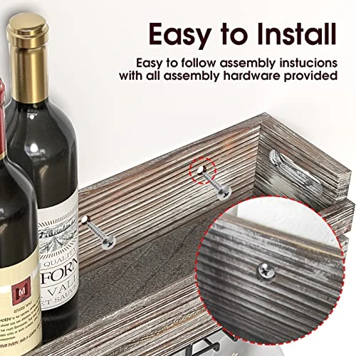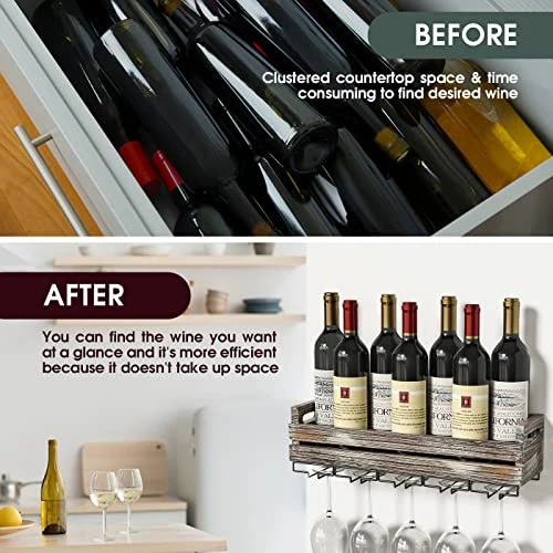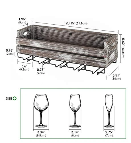 - [SPACE-SAVING] – This rack accommodates up to 6 bottles on the shelf and 5 to 10 glasses below ; it would be great wine holder shelf to store or start any wine collection!