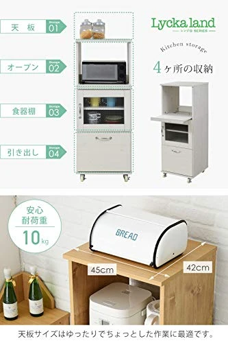 - Load Capacity: Top Board: Approx. 22.0 lbs (10 kg); Slide: Approx. 19.8 lbs (9 kg); Movable Shelves: Approx. 22.0 lbs (10 kg); Drawers: Approx. 15.4 lbs (7 kg); Movable Shelves: 1 / Back Cosmetic / 4 casters (2 of each); Can be used as a range wagon with shelves for storing household appliances such as rice cooker, microwave, etc. Can be used in various colors. is available in wood grain white and natural