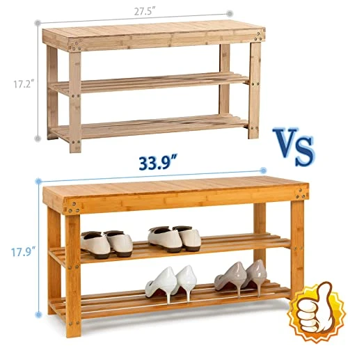 - Space-Saving Shoe Rack Bench: A combination of a shoe rack and bench to help you save space. ideal size of 34″ long x 12.5″ deep x 17.5″ tall. Great for organizing shoes, bags, plants, etc.
