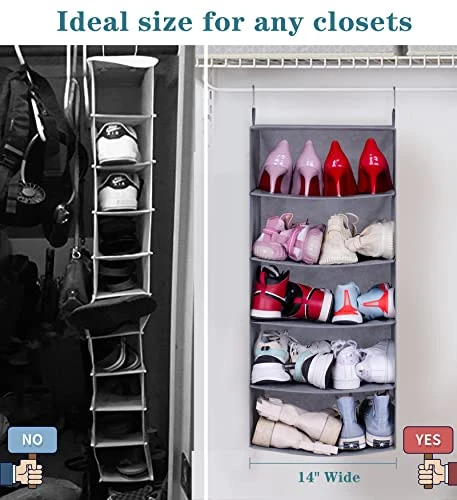 - Ideal Size: The shoe hanger organizer for closet is 30″ in height, perfect for most of closets, especially for small closet system to save up your life space. The closet shoe storage suit for bedroom, kids play room, dorm, apartment, collage. Overall size: 11.8″W x 14″D x 30″H;