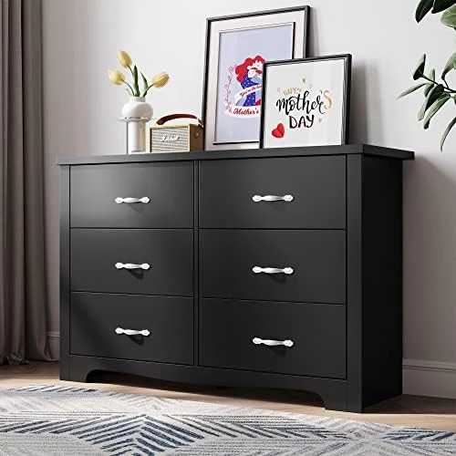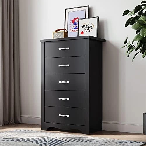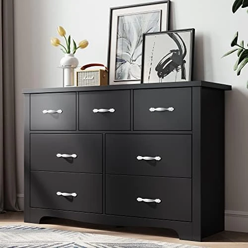 - 【Modern Drawer Dresser】 With a sleek black finish, metal handhelds, and curved kick plate, the LINSY HOME dresser has a new-age design that complements any existing decor.