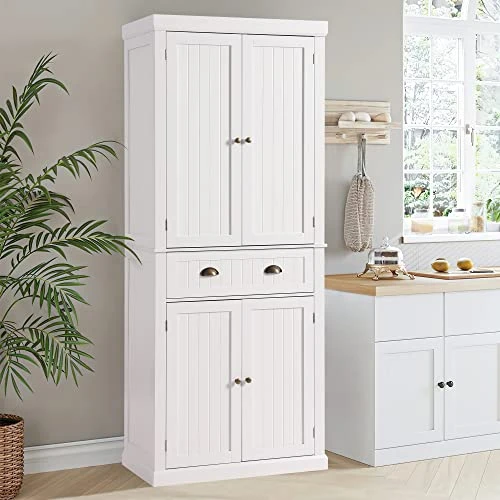 - 【Classic practical design】The weathered surface softens the classical lines and suits any home. A deep, easy-gliding drawer separates two large cabinets with magnetic closure doors and adjustable shelving inside. With genuine metal hardware and slatted details, kitchen clutter can be kept at bay in one handsome pantry.