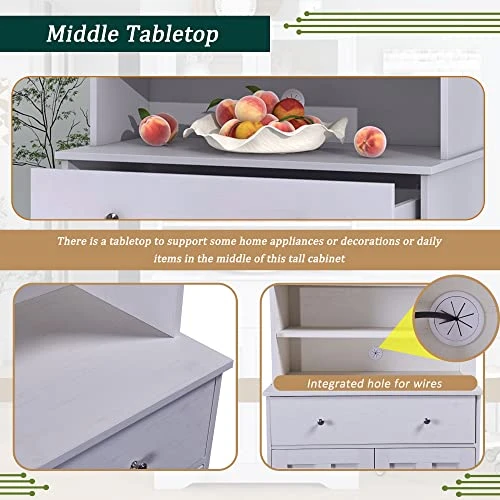 - Middle Tabletop: There is a tabletop to support some home appliances or decorations or daily items in the middle of this tall cabinet, since the bottom half of this tall cabinet is deeper than the top half. Integrated hole for wires, making it easy for a microwave or oven.