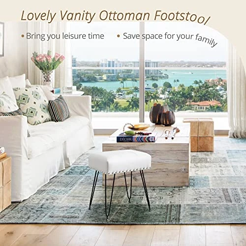 - 🐰 [Multi functional faux leather stool] – This exquisite makeup chair used in the dressing room is made of high-quality faux leather, and anyone can sit on it, which is comfortable. Four strong metal legs make this makeup chair more elegant and charming.This elegant leisure stool can not only be used as a stool for dressing table and ordinary makeup chair, but also as a shoe stool or footstool for you to put your feet on. Very practical, suitable for your house.