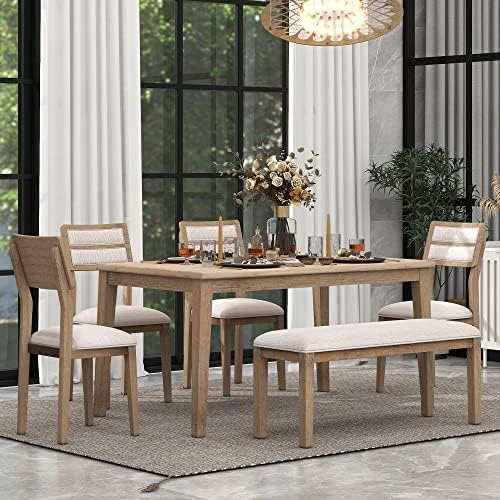 - [Family Dining Room Set for 6 People] – This set of tableware includes 1 table, 4 matching chairs and 1 bench. The design is practical and compact, which can comfortably fit into your space and fully accommodate you and your family. The design takes into account the sense of use and comfort. The spacious desktop is conducive to your placement of fruit bowls, vases, candles, etc., and it won’t be crowded.