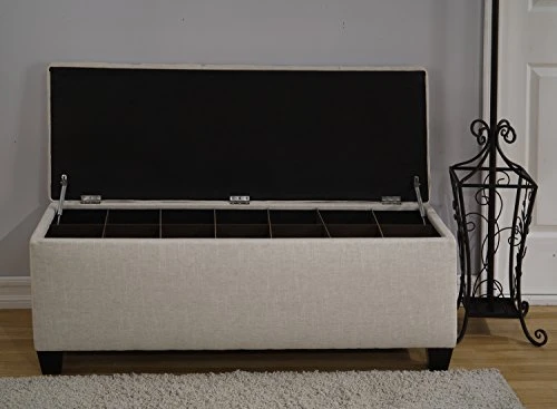 Modernize your home with this beautiful and well-built Sole Secret storage bench! Not only will this bench beautify your home, but it provides amazing storage options as well as occasional seating. Organizing shoes used to be a difficult chore that involved messy shoe racks or just a lot of clutter. Our shoe storage bench contains between 14 and 18 easily removable shoe slots that will allow you to organize and maximize your shoe storage. It can work for shoes, handbags or any type of clutter. Each shoe slot can hold up to a Men’s size 12 shoe or a Women’s size 14. Made of 100% polyester with a medium comfort level our bench is sure to accent any room its placed. Fuse utility and functionality into one solid beautiful shoe storage bench. Custom Tailored, Artisan Crafted and Proudly American made to fit any design or home. The Sand pattern is a beautiful contrast that would be a perfect fit in the bedroom or living room. So say goodbye to the old shoe rack and organize your shoes in style with The Sole Secret Shoe Storage Bench. The Sole Secret Where Fashion gets Organized.Upholstery Style: 13 Button TuftUpholstery Color: Sand Upholstery Material: 100 percent Polyester Seating Comfort: Medium Leg Finish: Espresso Available Slots: 18 Slot Size: 8″ x 5.5″ Material: Wood, Fire Retardent Foam Parts: • 4 Screw on Legs • 1 Long inside wood divider • 6 Shorter inside wood dividers • 2 Hydraulic arms Assembly Required Yes, Minimal assembly.