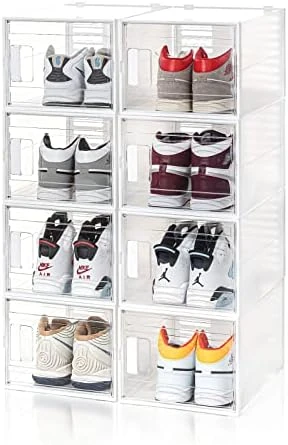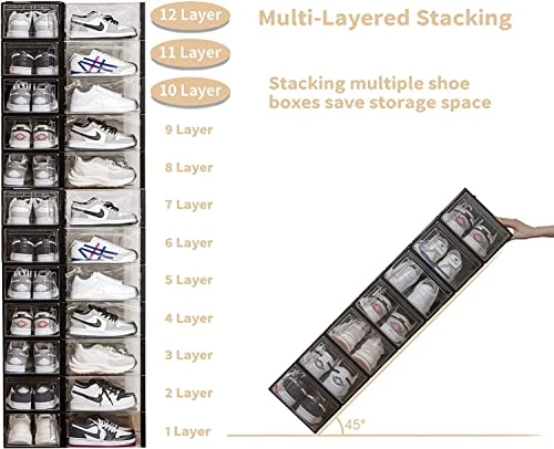 - ♚【Save Space】Stacking Storage Shoe Box help to simply organize closets and living areas, folding design makes each one easy to put together and folds into shape. When not in use, quickly unfolds for easy and convenient storage to save space.