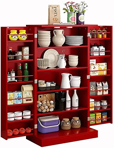 - [Ample Space] This kitchen pantry measuring 41″ H x 23.2″ W x 12″ D, features two cabinets that are open to reveal four center shelves and 12 pockets along with the interior doors, which add extra storage and create an organized kitchen.