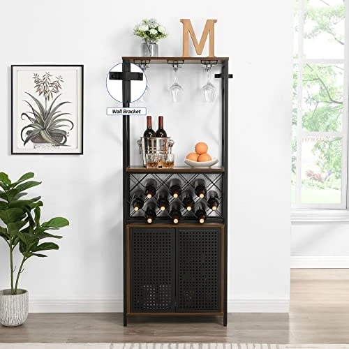 - [Large Capacity]-Equipped with glass holder wine rack and storage cabinet, the wine bar can hold up to 3 rows of wine glasses and 10 wine bottles. Thanks to the mesh door design, the storage cabinet is ventilate and dust-proof. Besides, the bottom cabinet provides sufficient space for cups, plates, basket and wine barrel.