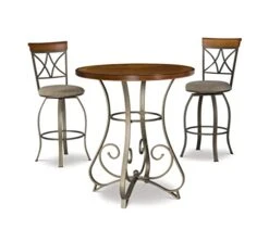 The Hamilton Pub Table features an interesting curve and scroll designed bottom. The top is a sleek “Brushed Faux Medium Cherry” wood, while the bottom is a “Matte Pewter and Bronze” metal and MDF with birch veneer. This piece is sure to add interest and ample table space.