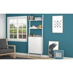 Manhattan Comfort Cooper Mid Century Modern Ladder Display Cabinet With 2 Floating Shelves, White