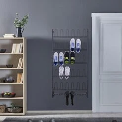 MyGift Black Metal Wall Mounted Boots And Shoe Rack, 18 Pair Entryway Shoe Storage Organizer Stand