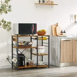 SUPERJARE Kitchen Bakers Rack With Power Outlet, Coffee Bar Table Station, Kitchen Microwave Stand With 6 S-Shaped Hooks, Wire Basket, Kitchen Storage Shelf Rack – Rustic Brown