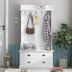 TAVENS Hall Tree With Storage Bench, 3-in-1 Entryway Bench With Coat Rack, Standing Coat Rack With 5 Metal Hooks And 2 Large Drawers For Hallway, Living Room, Mudroom 38.5”W X 15.7”D X 75”H,White