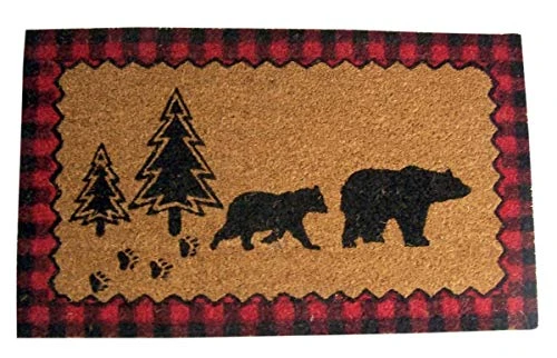 - Features a brown with a mother black bear and her cub, and has a decorative red plaid border