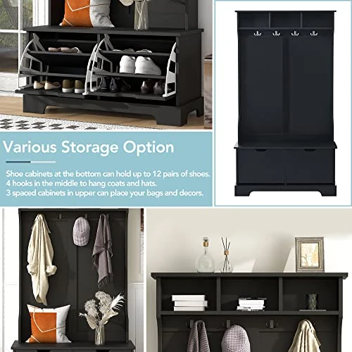 - Features:A classy and functional addition to your entryway or mudroom,Practical 4 In 1 Design: This hall tree combines the function of coat rack, shoe bench, storage shelves and flip down hidden design shoe cabinets.