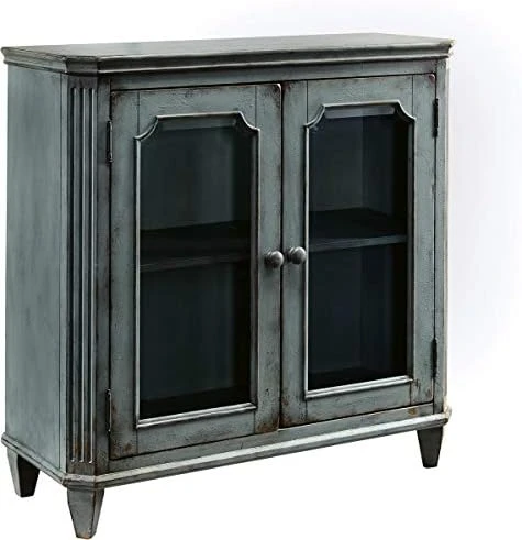 - DISTRESSED FINISH: Made of veneers, wood and engineered wood in an antiqued teal finish. Crafted with 4 cabinet doors with clear glass inlays that reveal 2 adjustable shelves