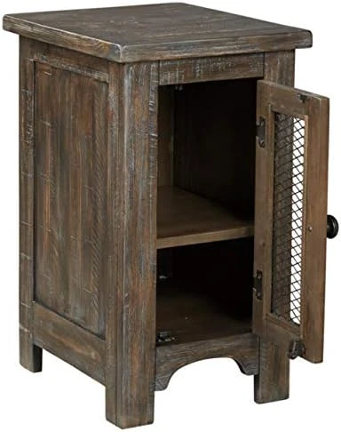 - HANDSOMELY CRAFTED: Table is made of veneers, wood and engineered wood in a distressed finish. Designed with a single door cabinet with metal grills and hardware and a center shelf