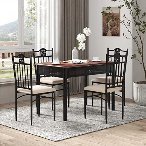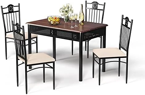 - 【Durable Material】Steel tubes, MDF boards with wood-look top keep the table durable and sturdy. And it’s needless to worry about the sharp iron would scrape your floor, for there are little pads under the table legs and chairs’ to avoid scratching. Also this 5 pcs dining set table could be easy for moving and clean.