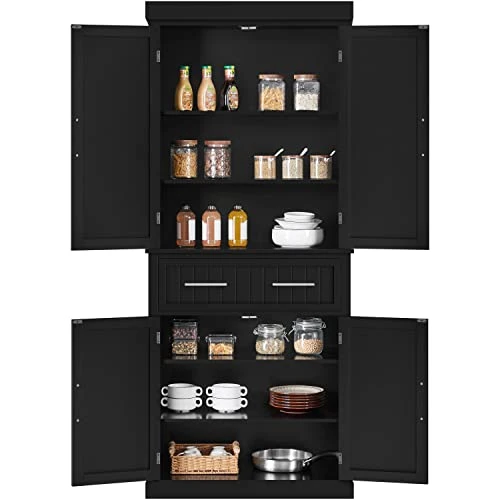 - 【Flexible Storage Organizer】Features a single center drawer with one fixed and one adjustable shelf hiding in both the upper and lower doors. Upper cabinets to store cereals, spices, and canned goods; lower cabinets to keep kitchen appliances, and containers, allowing for flexible storage space that fits your individual needs.