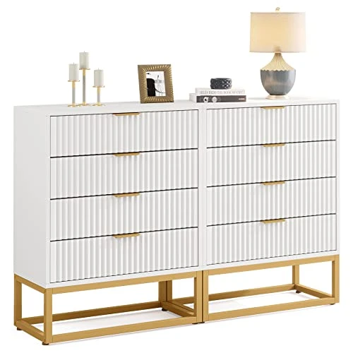 - 【Classy Modern Style】Want to update your room without losing out on style? You can’t go wrong with this nice crisp look dresser! Inspired by mid-century modern design, this bedroom dresser adorned with a striking gold-tone handles and support legs with aesthetically glossy fluted panel embellish drawer front draws your eye in, impart an enchanting style and character and adds a touch of glamour to your space.