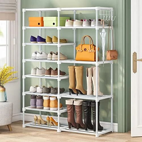 - Shoe Rack with Large Capcity: Our this shoe rack can store up to 24-30 pairs shoes, with different height design, it can fit boots, high heels or slippers. Our this shoe rack with 10 versatile hooks, you can hang a lot of things on it. Very innovative design. The PP plastic sheet of the shoe rack’s top is waterproof and easy to clean. Shoe shelf’s dimensions: 33.46″ W *12″D*42.13″H.